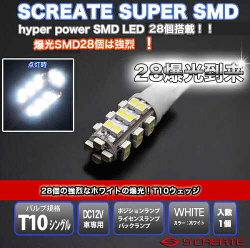 SCREATE SUPER SMD BULB3CHIP HYPER POWER SMD 商品詳細 3チップ×28SMDで84の強烈な爆閃光で衝撃的な明るさ! ○エスクリエイト スーパーSMDバルブシリーズ ○3チップハイパーパワー SMD 28連ウェッジシングル球 LEDカラー(ホワイト) ○超広角、超高輝度3チップSMDを搭載!28連搭載で84チップもの閃光でとてもまぶしい衝撃的な明るさを放ちます!○従来のLEDは正面のみに強く光ってしまいます。